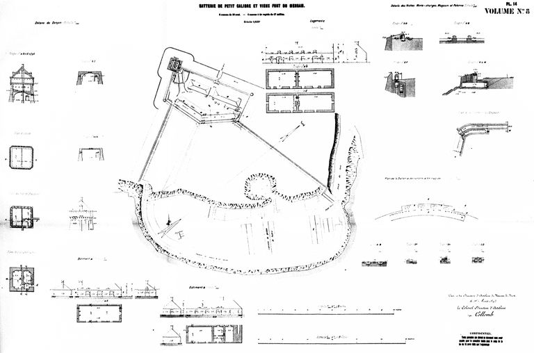 Plans et coupes de la batterie de petit calibre (4 canons à tir rapide de 47 mm) et du vieux fort du Mengant, Direction d'Artillerie du génie de Brest, 10 août 1893, par le colonel Directeur d'Artillerie : CollombImmatriculation