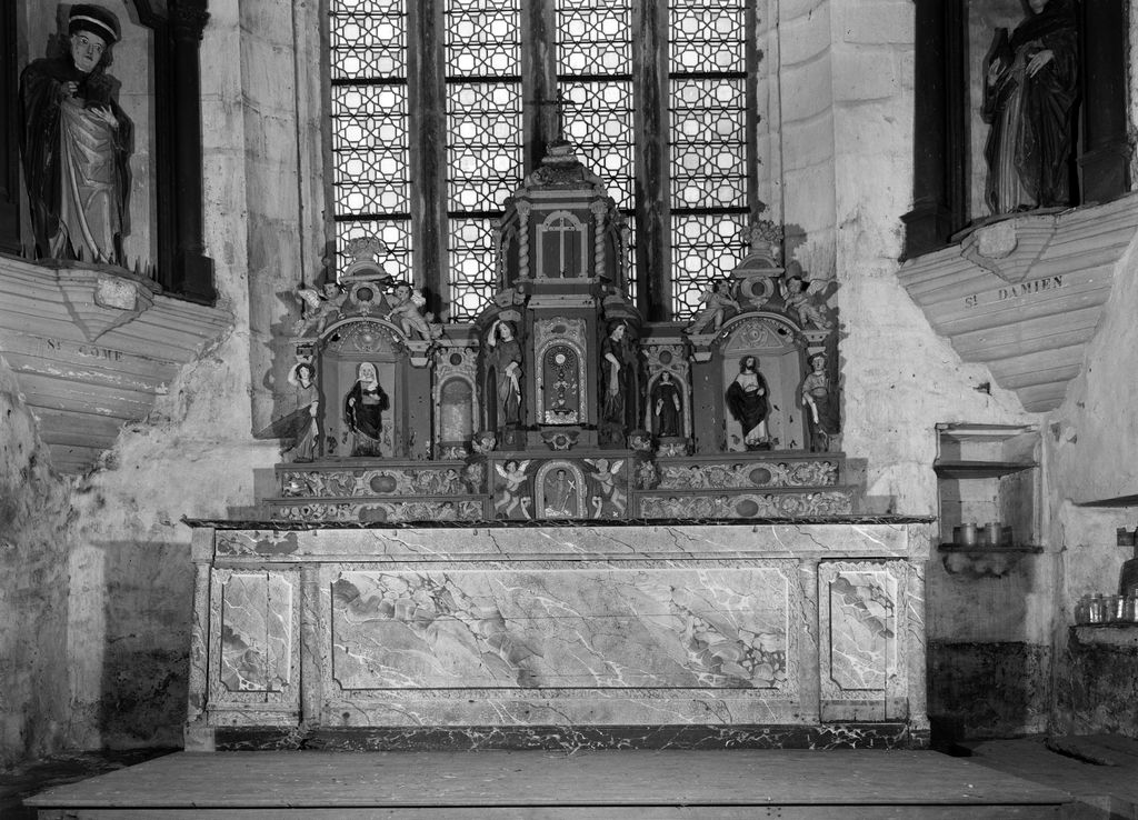 Autel, tabernacle, gradins d'autel (2) (maître-autel, tabernacle à ailes), chapelle Saint-Damien, Saint-Côme (Saint-Nic),