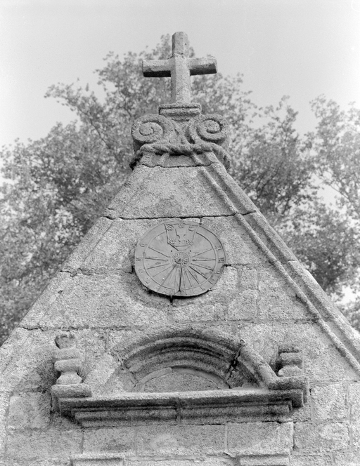 Porche sud, pignon, détail du couronnement.Immatriculation