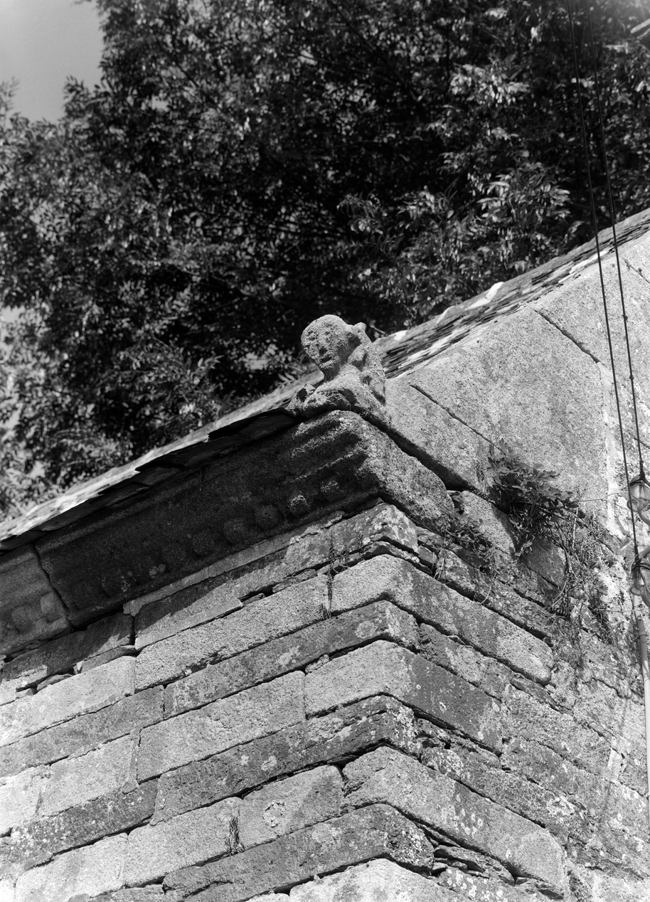 Angle sud-est, détails corniche, appareillage, pierre d'assise sculptée du rampantImmatriculation
