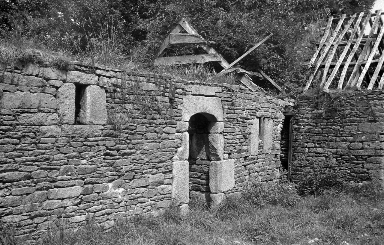 Plougonven, Lezoen, habitat ruiné, charpente (état 1970)Immatriculation