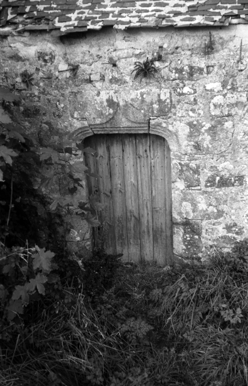 Roscaradec, maison 1. Elévation antérieure nord, détail de la porte d'entrée. (1970)Immatriculation