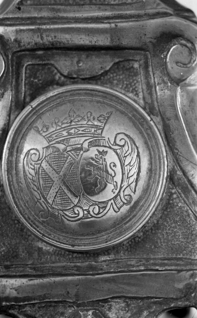 Croix d'autel, vue de détail des armoiries.Immatriculation