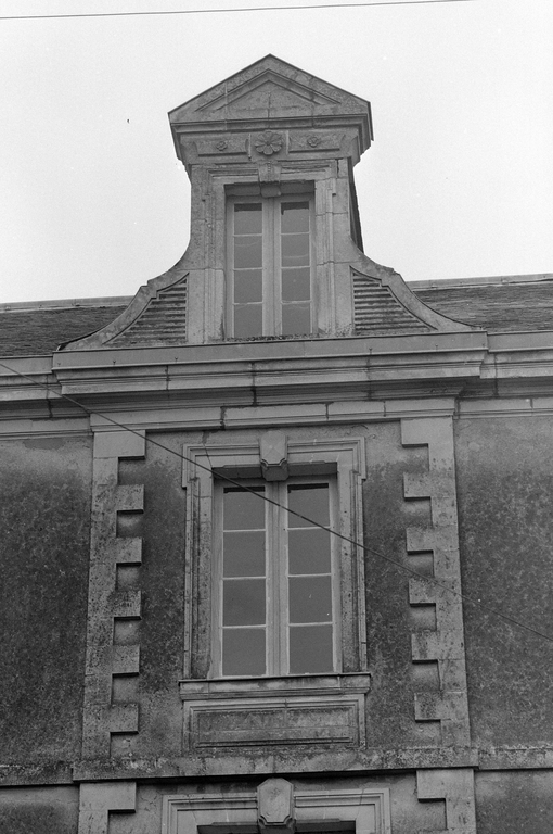 Façade nord, travée centrale, vue de détail de la lucarne.Immatriculation