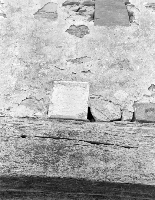 Porche, vue de détail de la pierre avec inscription.Immatriculation