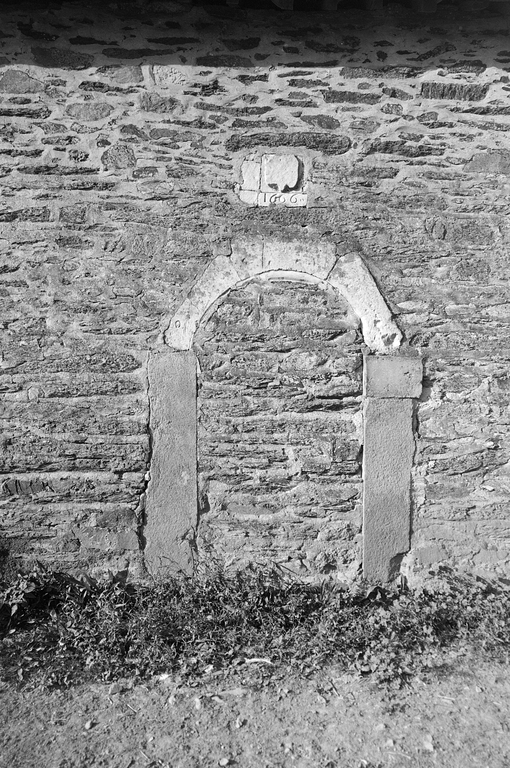 Chapelle, face sud, détail de porte obturée avec pierre datée.Immatriculation