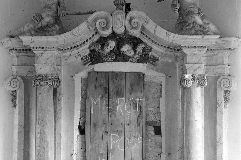 Chapelle, retable, vue de détail des volutes et têtes d'angelots.Immatriculation