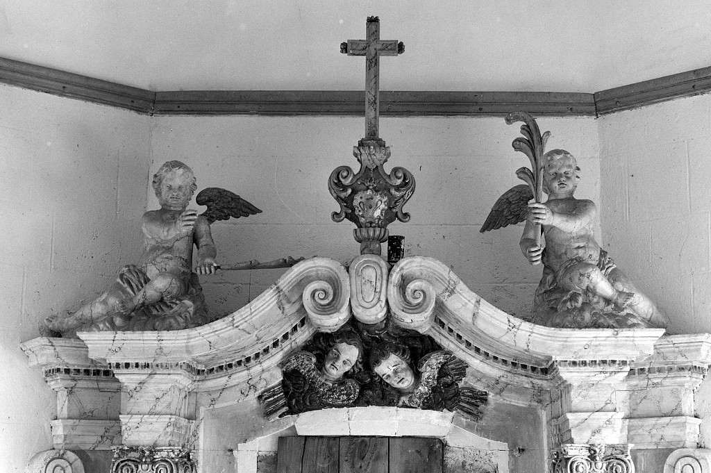 Chapelle, retable, vue de détail des volutes et têtes d'angelots.Immatriculation