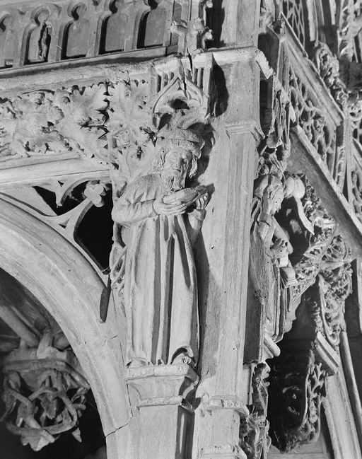 Jubé - Face ouest, statuette de vieil homme lisant, situé au nord, sur le retour d'équerre de la galerie, à l'écoinçon de l'arcade.Immatriculation