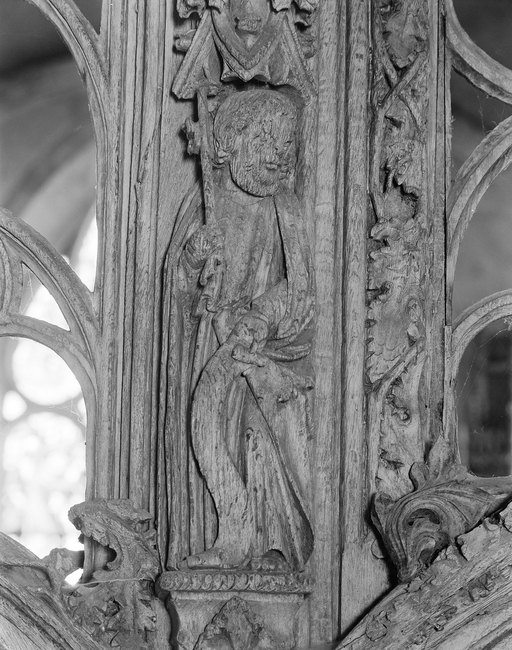 Jubé - Face ouest, statuette de saint Pierre sculptée à la partie supérieure du montant gauche de la porte.Immatriculation