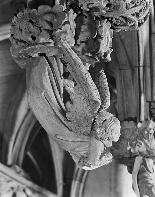 Jubé - Face ouest, ange sculpté sur le cul-de-lampe situé à la retombée nord-ouest de la voûte centrale de la galerie.Immatriculation