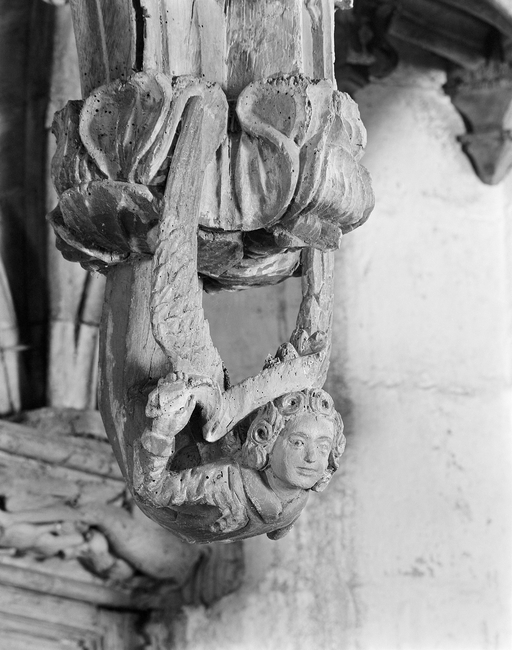 Jubé - Face ouest, ange sculpté sur le cul-de-lampe situé à la retombée des deux voûtes sud de la galerie.Immatriculation