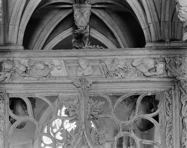 Jubé - Face ouest, scène sculptée dans la partie centrale de la traverse supérieure de la clôture (messe de saint Grégoire).Immatriculation