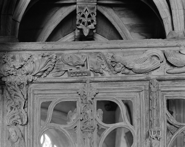 Jubé - Face ouest, scène sculptée sur la traverse supérieure de la clôture au-dessus du troisième panneau en partant du sud (le renard prêchant les poules).Immatriculation