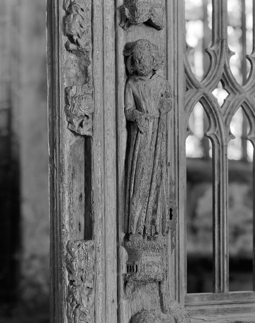 Jubé - Face ouest, statuette sculptée dans la partie médiane du montant droit de la porte.Immatriculation