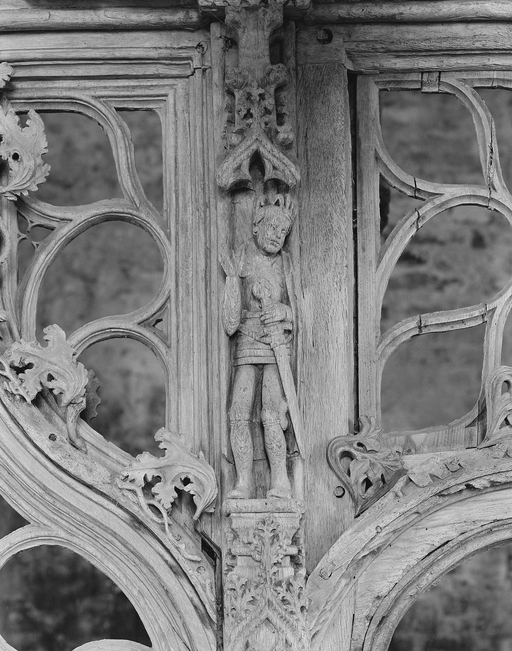 Jubé - Face est, statuette de chevalier sur le montant gauche de la porte axiale.Immatriculation