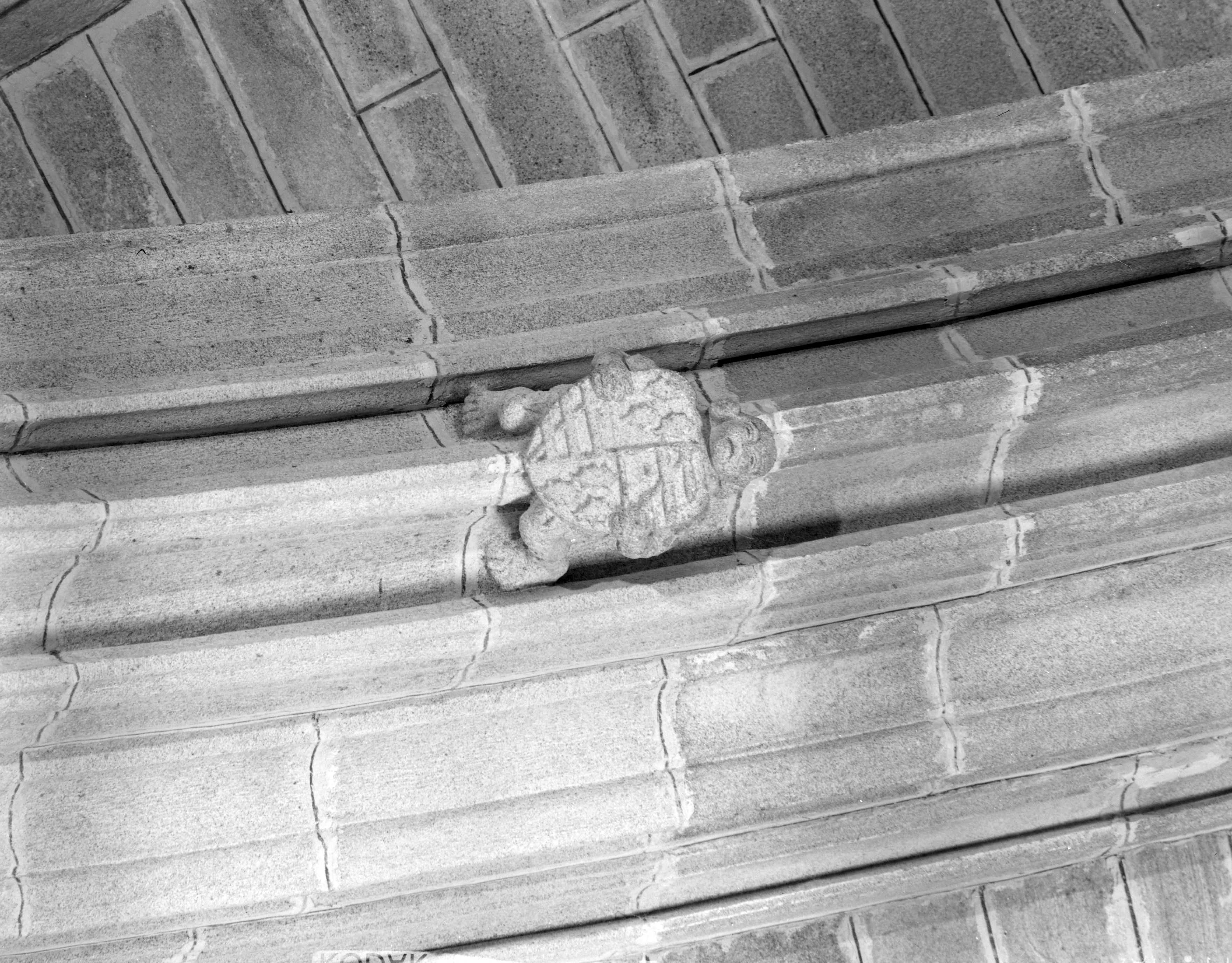 Personnage tenant un écu, à cheval sur l'arcade sud de la croisée (côté est).Immatriculation