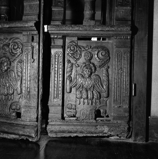 Porte du jubé, vantail de droite, détail du panneau inférieur.Immatriculation