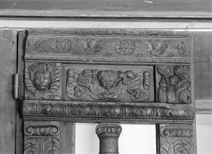 Porte du jubé, entablement du vantail du gauche.Immatriculation