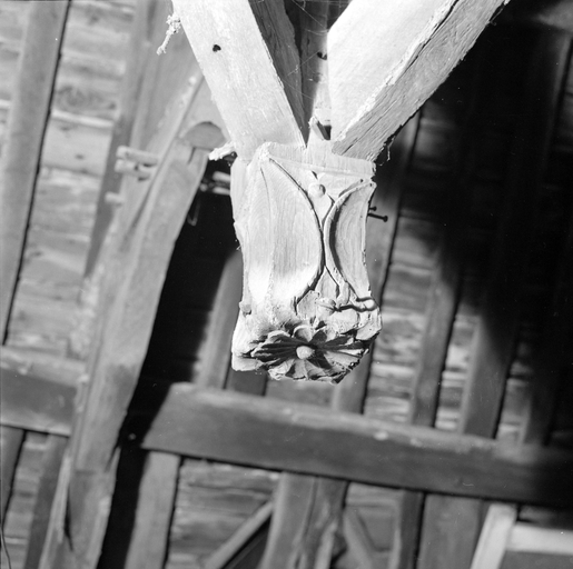 Charpente, extrémité sculptée du poinçon.Immatriculation