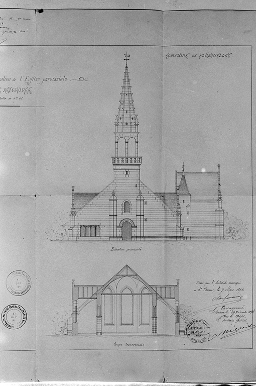 Dossier de restauration établi en 1894 par l'architecte Le Guerranic, planche datée du 7 mars : détail de la coupe et de l'élévation ouestImmatriculation