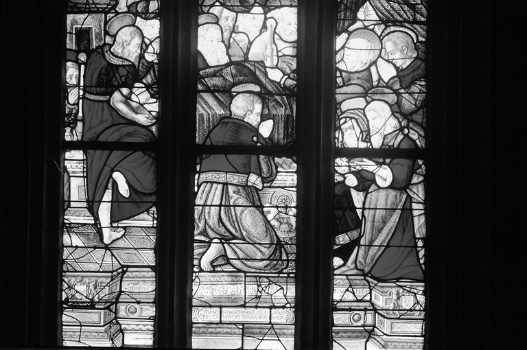 Verrière (verrière hagiographique) : Mort de la Vierge, église paroissiale Saint-Maudez (Duault),
