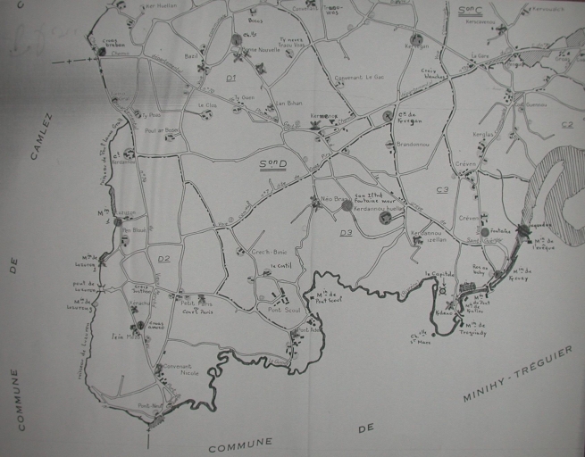 Extrait de la carte du patrimoine de Plouguiel, 1971 : sections D et C de la commune : remarquer les moulins le long du Guindy, avec les anciens chemins (Nicole Chouteau)Immatriculation
