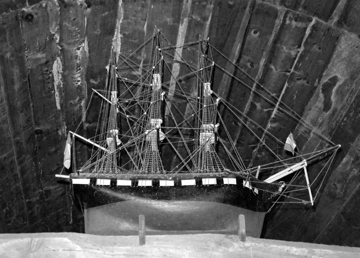 Vue d'un ex-voto : maquette de trois-mâts voiles carrées, chapelle Saint-Nicolas (Chouteau, Nicole, ADAGP, 1971)Immatriculation
