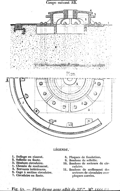 Coupe suivant AB et plan de la plate-forme pour affût modèle 1888 PA de canon de 32 cmImmatriculation
