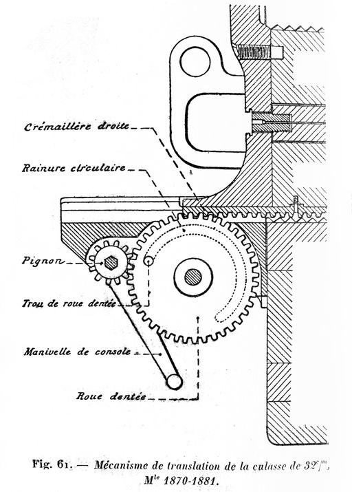 Plan détaillé du mécanisme de translation de la culasse d'un canon de 32 cm modèle 1870-1881Immatriculation