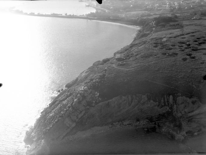 Vue aérienne oblique de la pointe du Grand Gouin en 1971 : réduit de batterie de côte du Petit Gouin, tranchées, bunkers au milieu de nombreux cratères de bombeImmatriculation