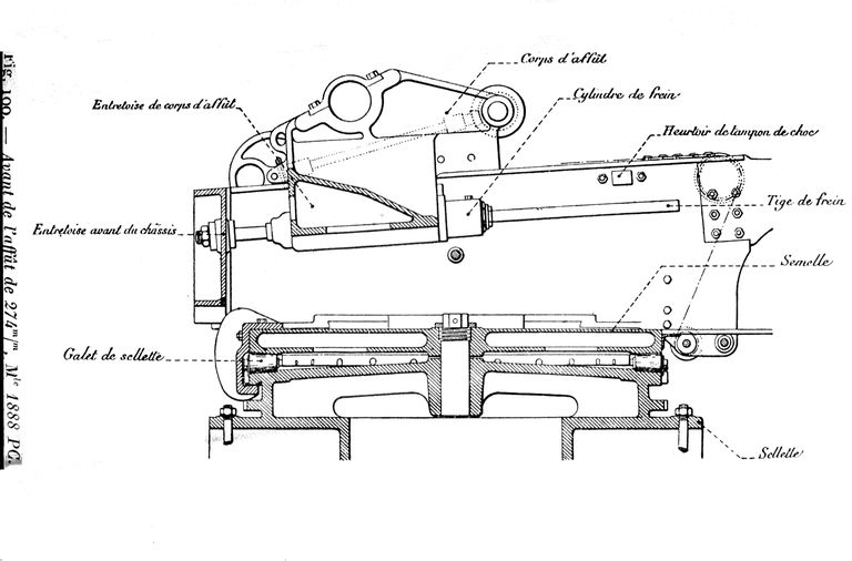 Plan détaillé de l'avant d'un affût modèle 1888 PC pour canon de 274 mmImmatriculation