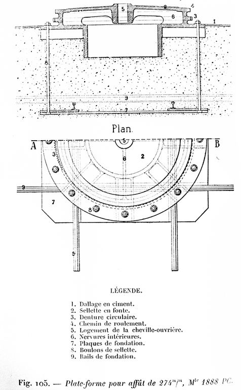 Coupe et plan d'une plate-forme pour affût modèle 1888 PC destiné à un canon de 274 mmImmatriculation