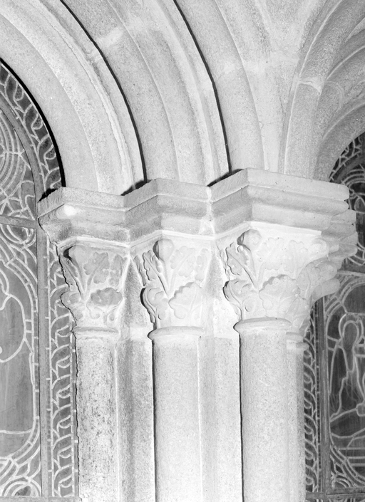 Corps de bâtiment D, salle capitulaire, mur est, chapiteaux de la baie géminée à droite de l'autel (1965)Immatriculation