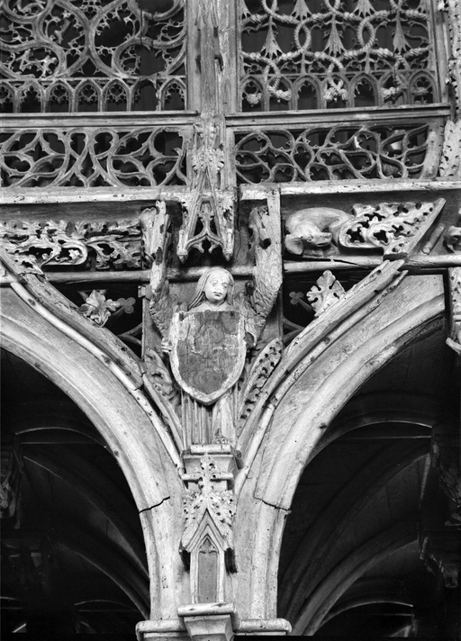Jubé - Face est, tribune, ange de gauche, armoiries martelées, dégagées en 1971.Immatriculation