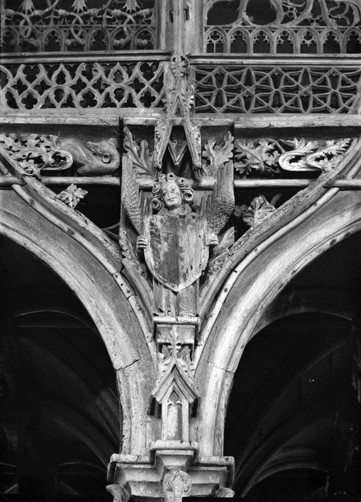 Jubé - Face est, tribune, ange de droite, armoiries martelées, dégagées en 1971.Immatriculation