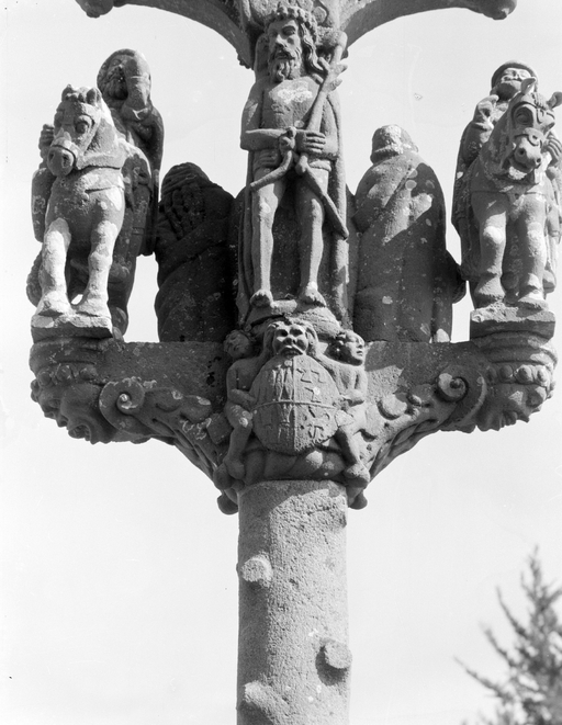 Calvaire, face ouest, 1ère traverse, détail personnages et armoiriesImmatriculation