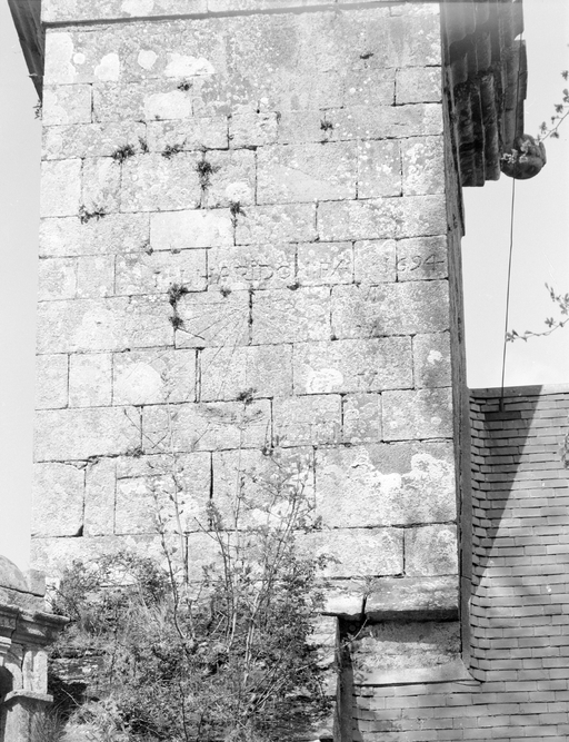 Détail cadran solaire et inscription sur la face sud de la tour du clocherImmatriculation