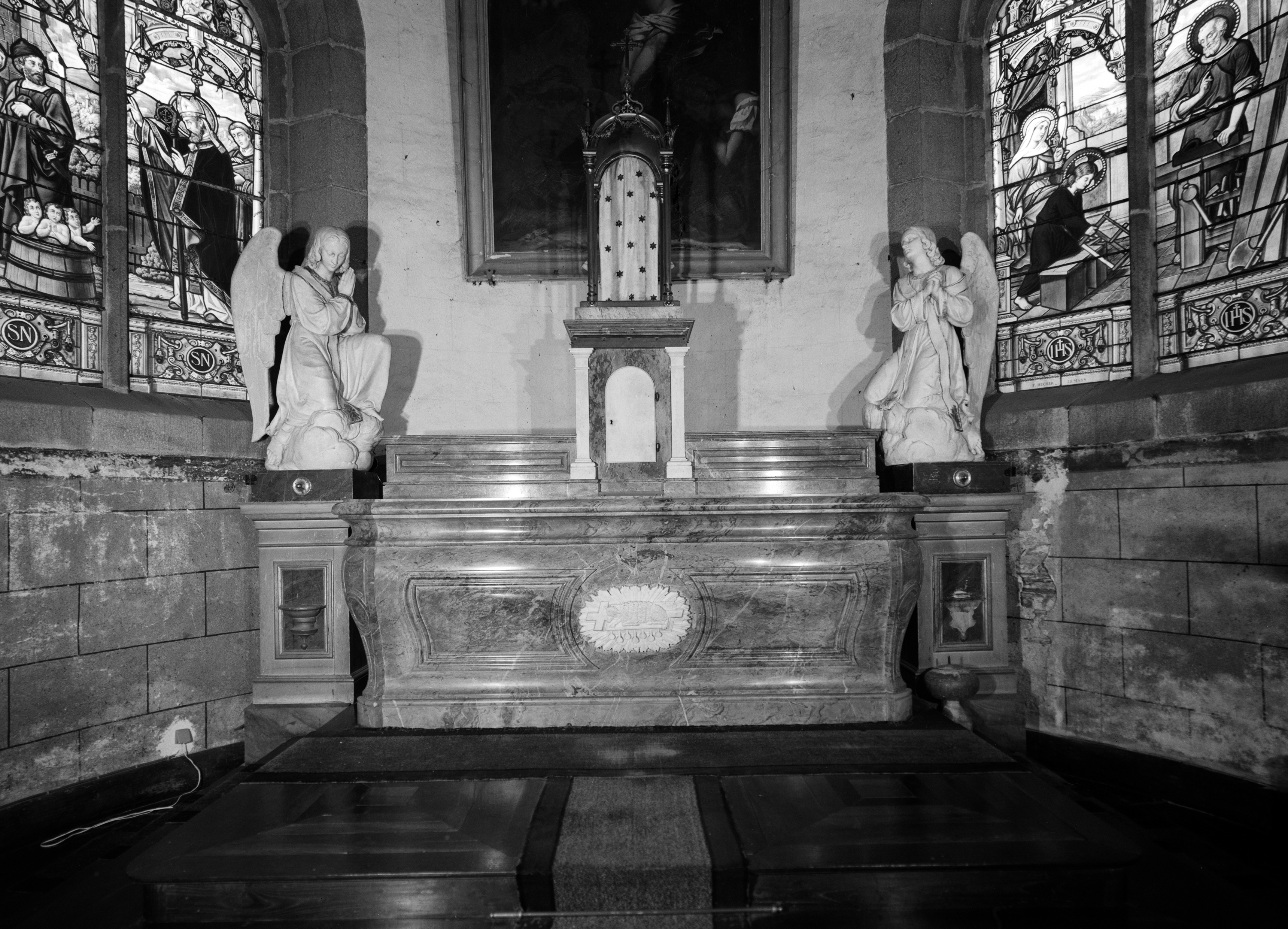 Ensemble du maître-autel : autel, tabernacle, gradin d'autel, 2 statues d'anges, église paroissiale Saint-Nicolas (Port-Launay),