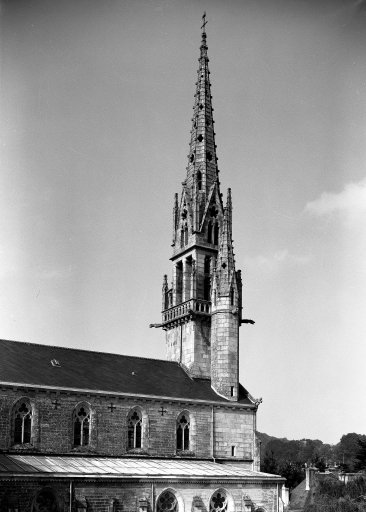 Châteaulin, église paroissiale Saint-Idunet : clocher, vue d'ensemble prise du nord, état en 1972Immatriculation