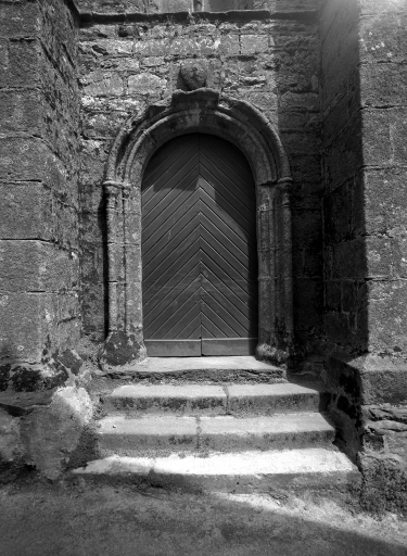 Plomodiern, église paroissiale Saint-Mahouarn : façade occidentale, détail porte, état en 1972Immatriculation