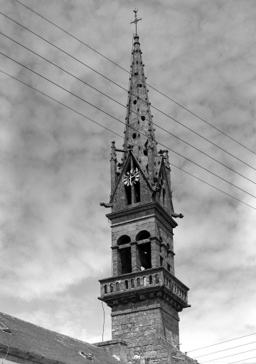 Plomodiern, église paroissiale Saint-Mahouarn : façade occidentale, détail clocher, état en 1972Immatriculation