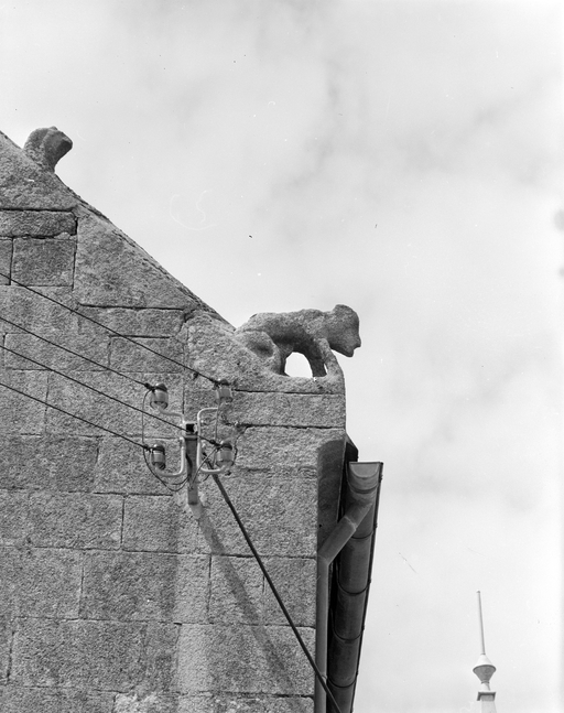 Plomodiern, église paroissiale Saint-Mahouarn : façade sud, pignon du transept, crossette droite, état en 1972Immatriculation