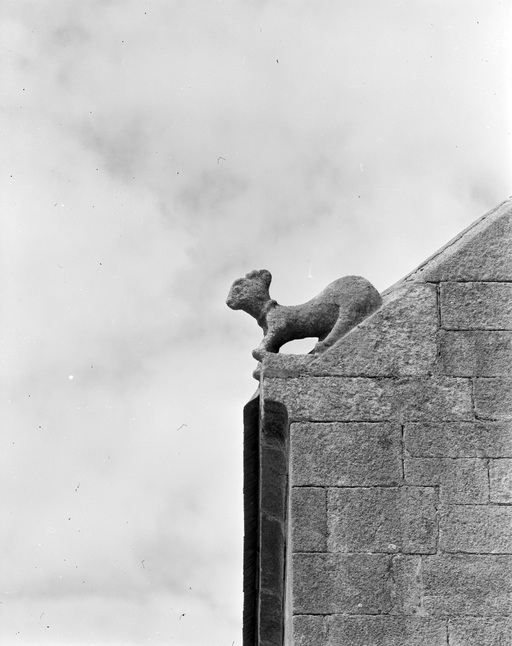 Plomodiern, église paroissiale Saint-Mahouarn : façade sud, pignon du transept, crossette gauche, état en 1972Immatriculation