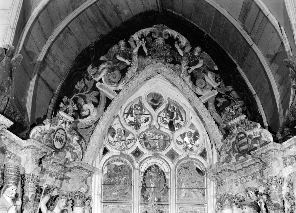 Vue générale du fronton central, au centre Dieu le Père entouré de deux angesImmatriculation