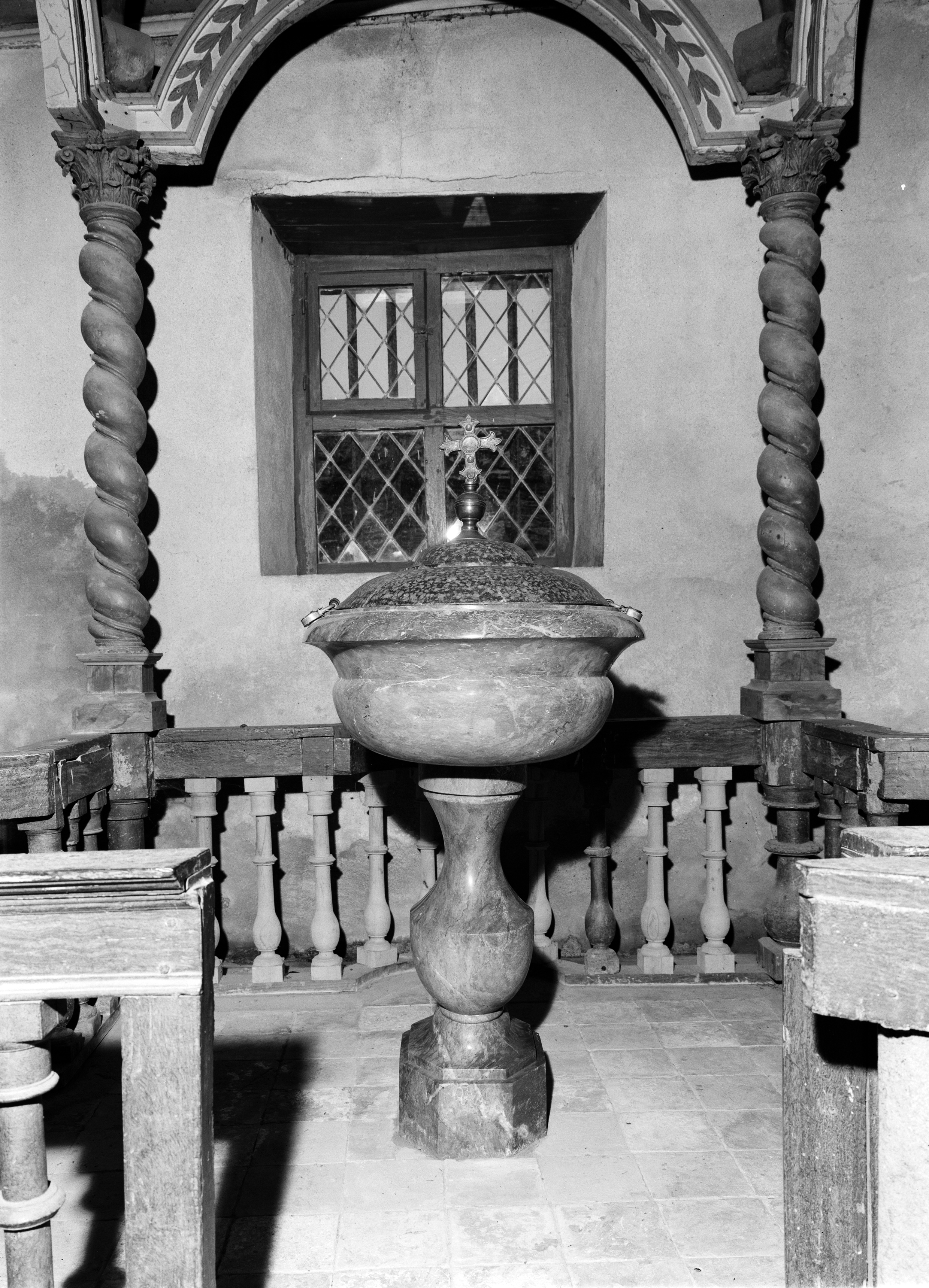 Fonts baptismaux, clôture des fonts baptismaux, baldaquin des fonts baptismaux, église paroissiale Saint-Coulitz (Saint-Coulitz),