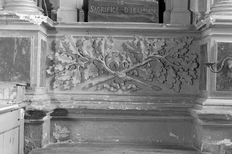 Retable du choeur, stylobate aile droite, vue générale rapprochée.Immatriculation