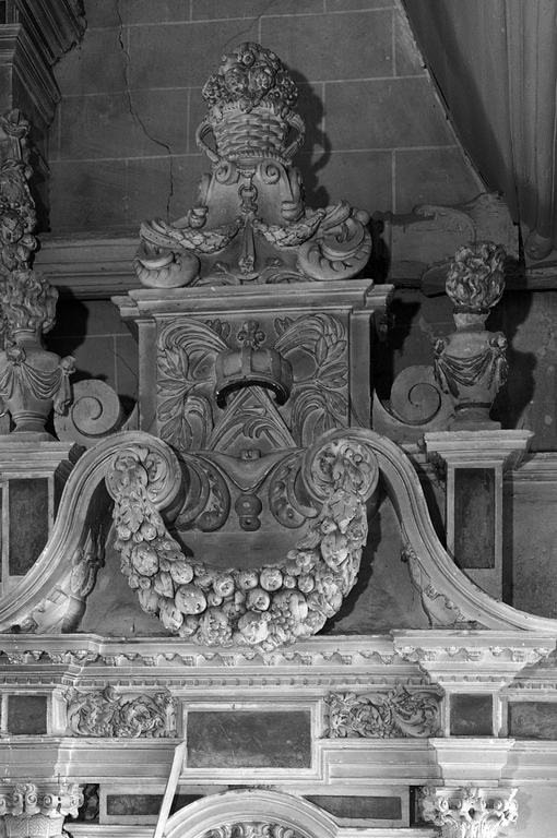 Retable du choeur, couronnement de l'aile droite, vue générale.Immatriculation