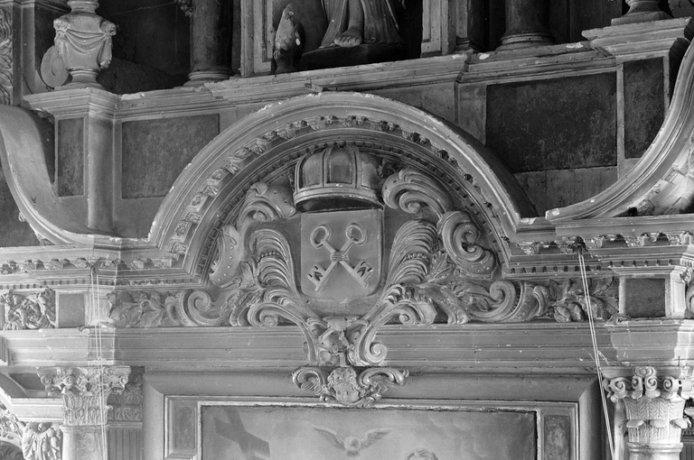 Retable du choeur, entablement du corps central, vue générale.Immatriculation