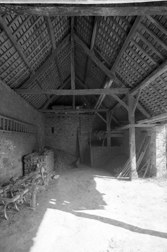 Dépendances ouest, remise et porche, charpente, vue générale.Immatriculation